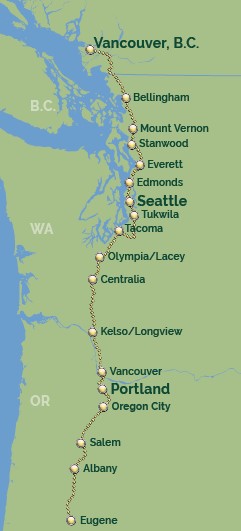 The Amtrak Cascades Train runs on the route from Vancouver, British Columbia, to Seattle, Portland, and Eugene, Oregon, past Mount St. Helens and across the Columbia River Gorge.
